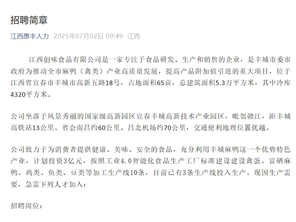 江西創味食品有限公司是一家專注于食品研發(fā)、生產和銷售的企業,是豐城市委市政府為推動全市麻鴨(禽類)產業高質量發(fā)展,提高產品附加值引進的重大項目,位于江西省宜春市豐城市高新五路18號,占地面積65畝,總建筑面積5.3萬平方米,其中冷庫4320平方米。公司坐落于風...